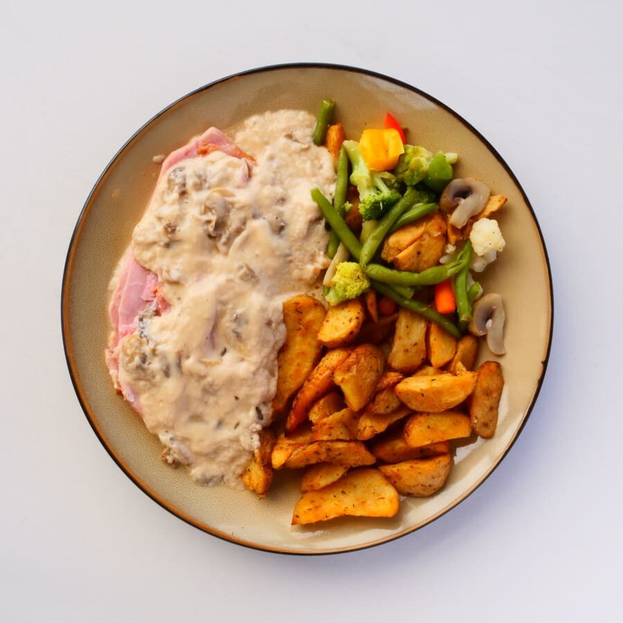 Beenham in roomsaus met aardappelpartjes en groentemix