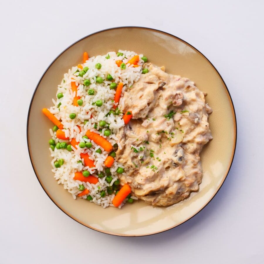 Kippenvlees, kippenvet, water, zout, champignons, tarwemeel, peper, melkpoeder, soja, water, kookroom, heel eipoeder, selderij, eigeel, palmvet, raapzaadolie,  erwten, wortel, rijst.