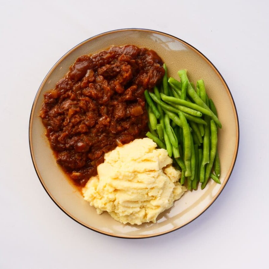 Paardenvlees, rundvlees, suiker, gemodificeerd maïszetmeel, appelstroop, appelsap, beetwortelsap, tomatenpuree, raapzaadolie, azijn, witte peper, foelie, kurkuma, tarwebloem, aardappelen, nootmuskaat, peper, roomboter, tijm, laurier, soja, boontjes.